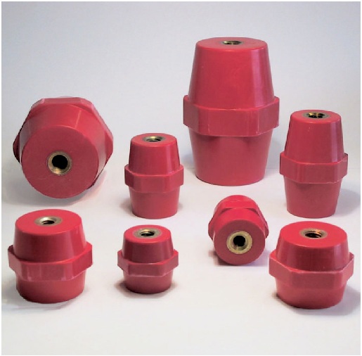 Low tension insulators Our insulators are made from red polyester which is strengthened with 18% spun glass. The working range of temperature is between -40°C and +130°C (-40 and +266 Fahrenheit). The metallic inserts have an ISO-metric female screw thread. The insulators are available in heights from 10mm to 100mm with a gradation of 5mm. For fastening, the insulators have a central hexagonal band. Special realisations are possible! |